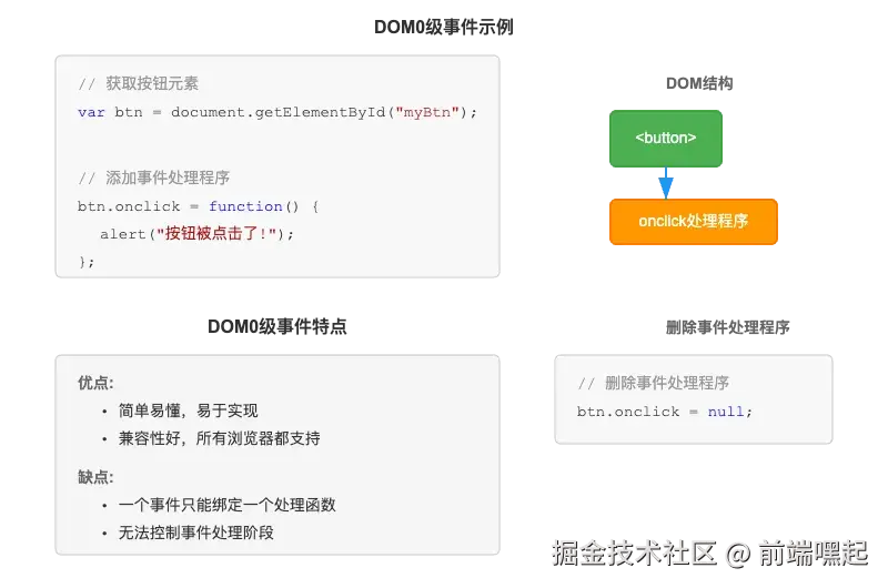 从图中我们可以看到,事件从document对象开始,逐级向下传播到目标元素(捕获阶段),然后在目标元素上触发(目标阶段),最后再逐级向上传播回document对象(冒泡阶段)。 DOM0级事件处理程序DOM0级事件处理程序是最早期的事件处理方式,它非常简单直接。通过将一个函数赋值给一个事件处理属性来实现,例如: var btn = document.getElementById("myBtn");