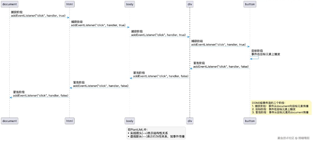 在前端开发的世界里,事件处理是构建交互式网页的核心机制。从用户点击按钮到页面响应,从表单验证到动态内容更新,都离不开事件系统的支持。然而,事件处理并不是一成不变的,它经历了从简单到复杂、从粗糙到精细的演进过程。今天,我们就来深入探讨JavaScript事件流的奥秘,从DOM0级事件到DOM3级事件,看看它们是如何一步步完善,最终成为现代Web开发不可或缺的一部分。 前言JavaScript事件流描述的是从页面中接收事件的顺序。在浏览器发展的早期,不同的浏览器厂商对事件流的理解并不一致,这就导致了兼容性问题。随着Web标准的推进,事件流逐渐规范化,形成了我们今天所熟知的三个阶段:事件捕获、目标阶段和事件冒泡。 为了更好地理解事件流的工作原理,我们先来看一张总览图,它展示了事件在DOM树中的传播路径: