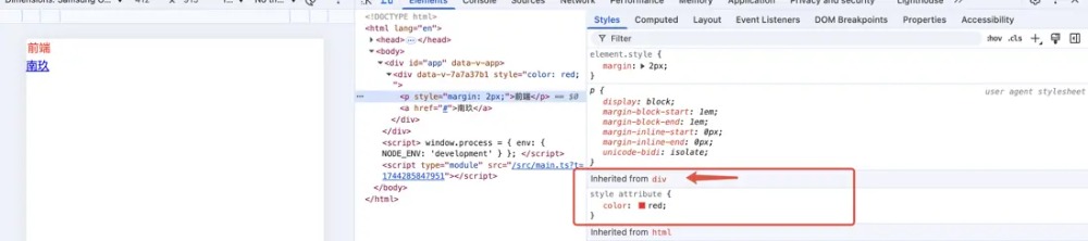 同样还是上面的代码,我们可以看到对于p标签我们既没有声明他的文字颜色,用户代理样式表同样也没声明文字颜色,那么它的红色是从哪来的呢?