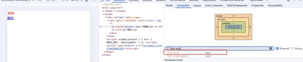 代码同上,比如还是p标签,我们没有自定义声明它的font-size,用户代理样式表也同样没有声明,它的父级元素同样没有声明。