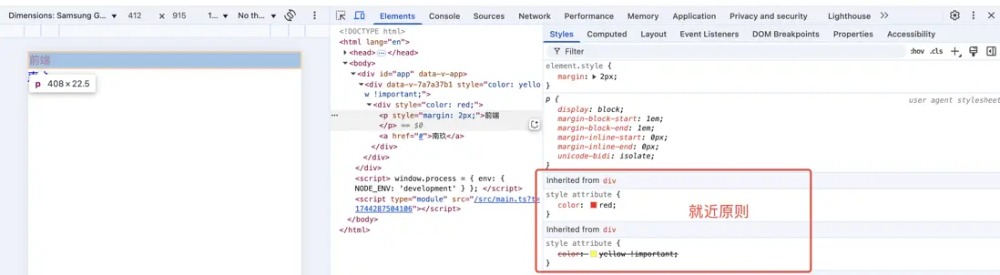 所以此时p标签就会继承父元素的color属性,渲染成红色字体。这里需要注意的是继承采用就近原则,与权重无关