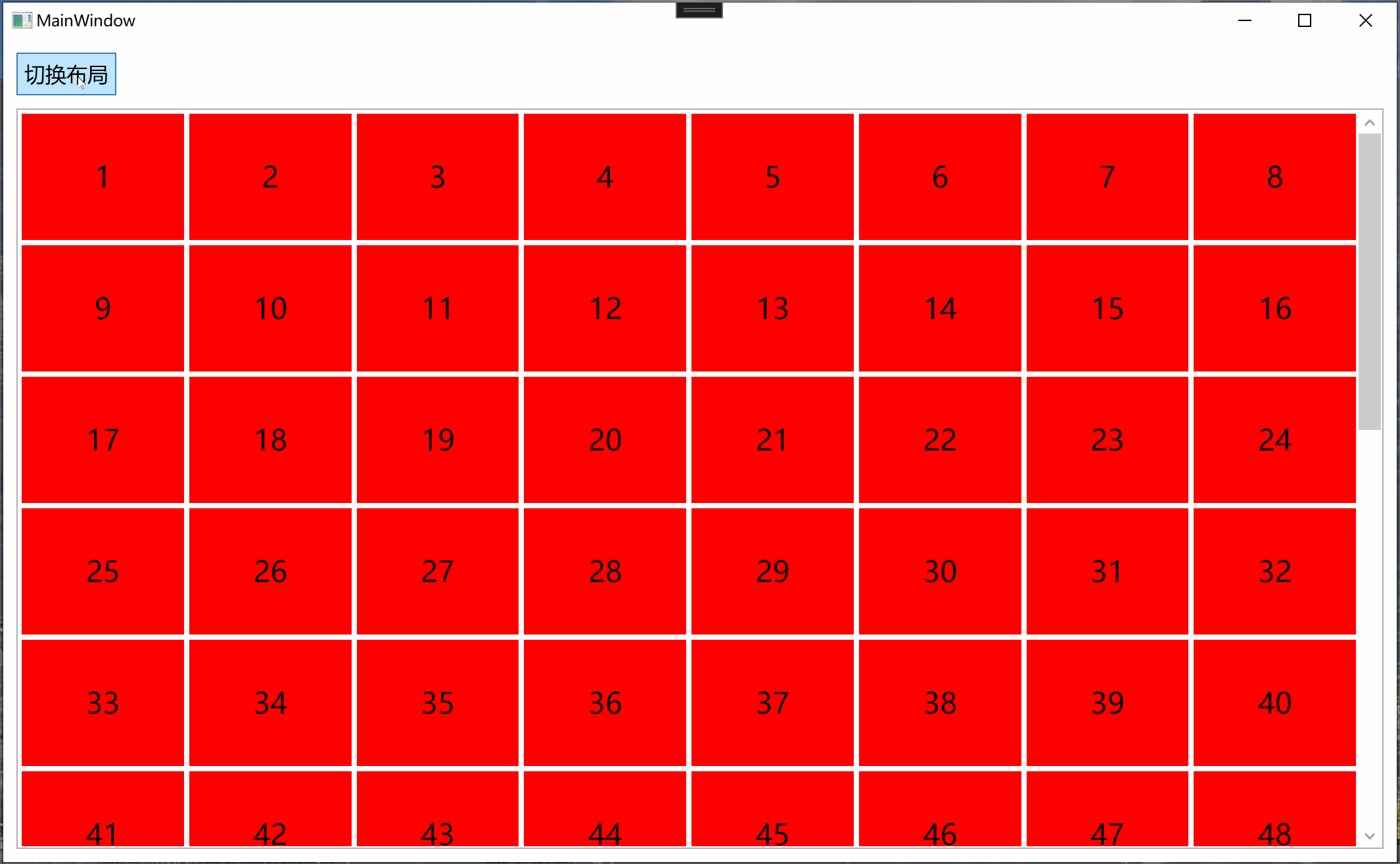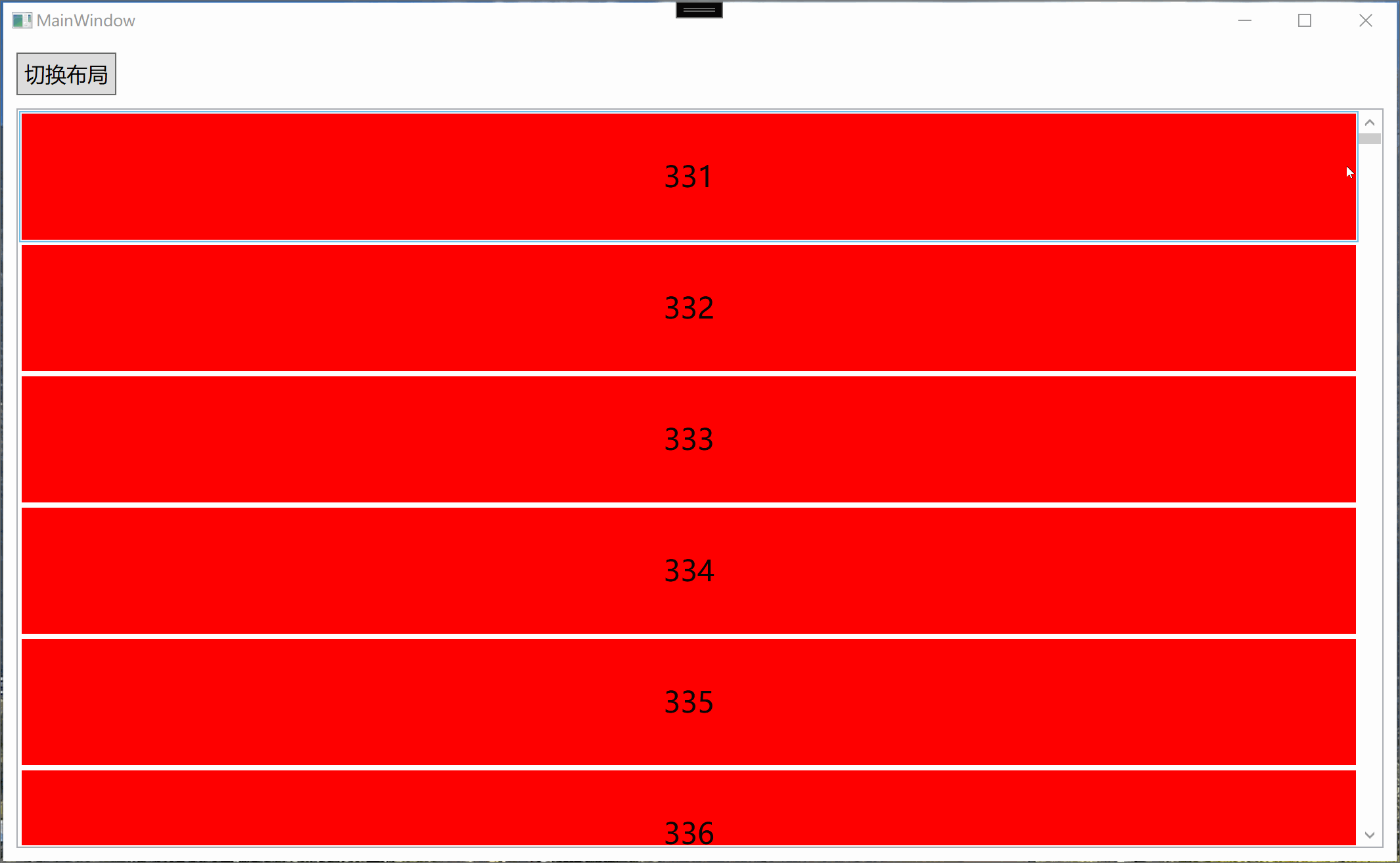 为了能够演示布局切换的过渡效果,这里除了上面的StackPanel布局以外还实现了UniformGrid布局,以下分别演示1亿条数据布局切换及非虚拟化状态下的布局切换过渡效果。