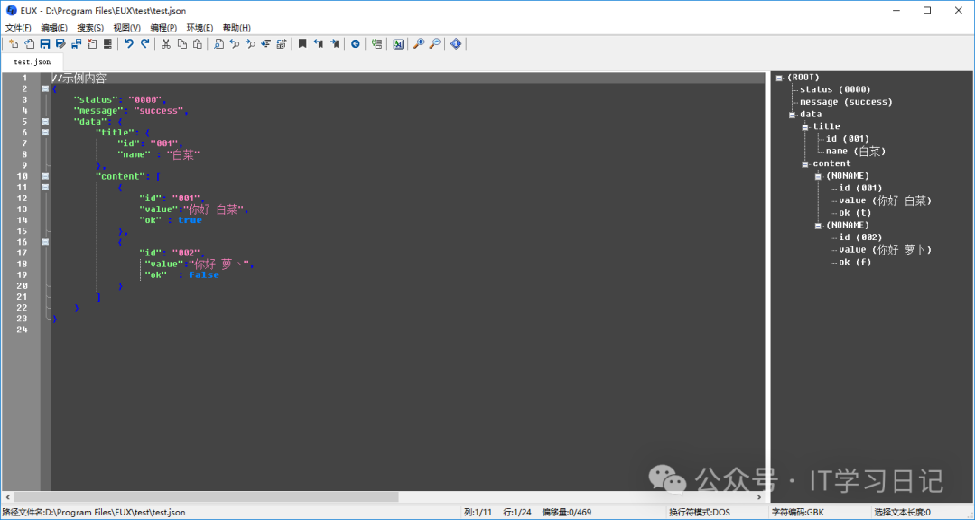 打开JSON、XML文件时,右侧树控件中自动显示解析出来的文档结构,双击右侧文档结构某元素,左侧自动定位到该标记开始处